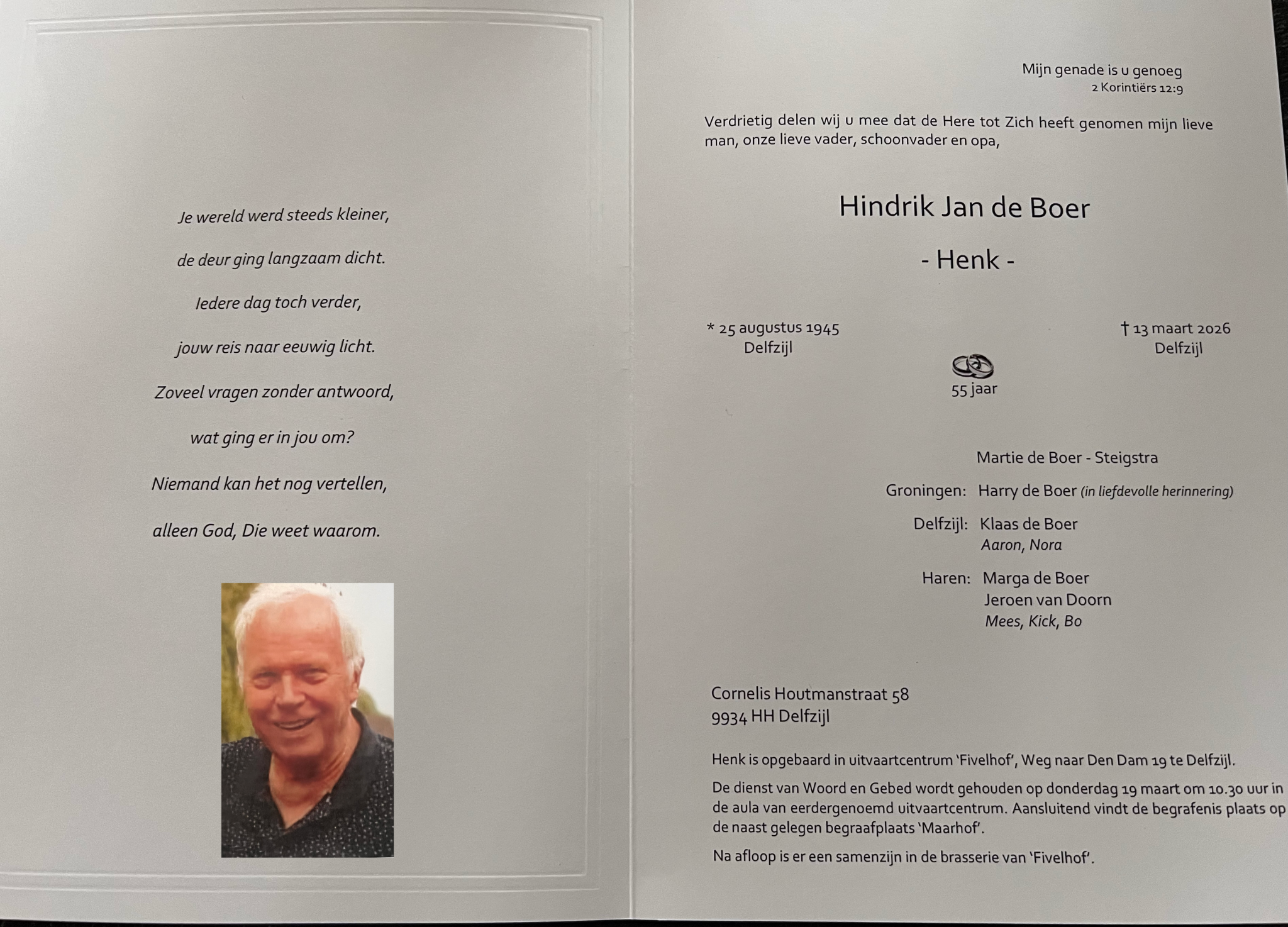Ons bereikte het trieste bericht dat na een afnemende gezondheid op 80-jarige leeftijd is overleden Henk de Boer.